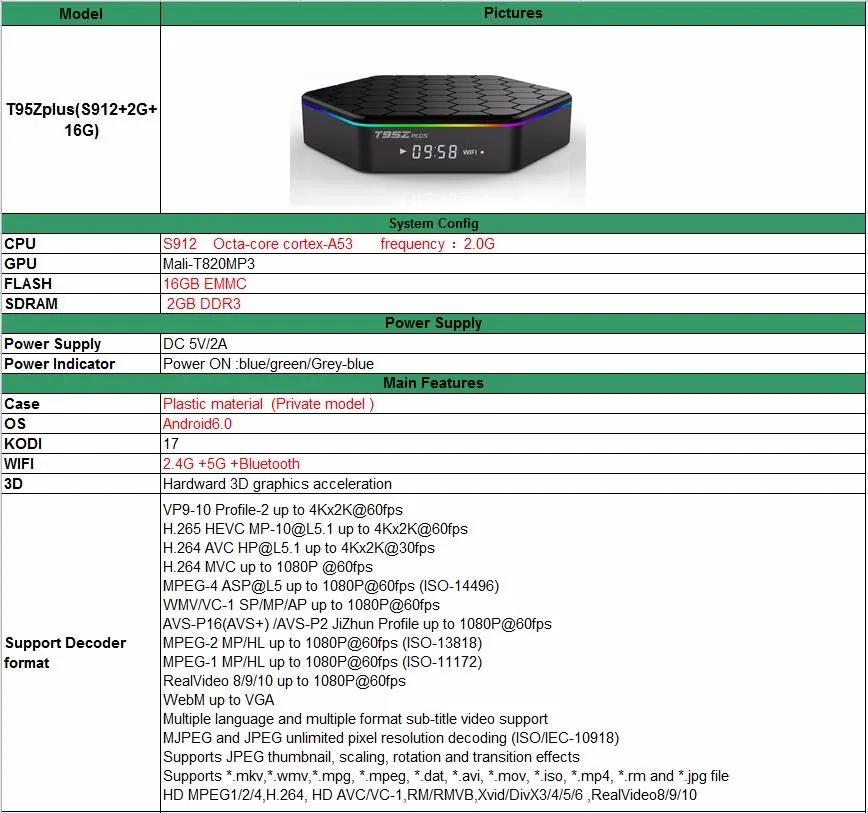 Genuine T95z Plus 2GB/16GB Amlogic S912 Android 6.0 Smart TV Box Octa-core Kodi17.0 Fully Load,5GWIFI,BT4.0,4K,H.265 Set Top Box